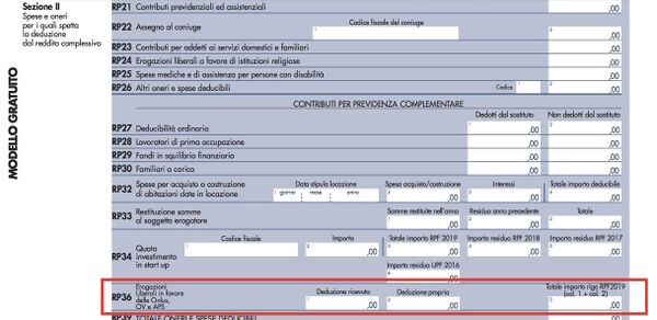 • Per la deduzione fiscale, indicare l'erogazione liberale nel rigo RP36.