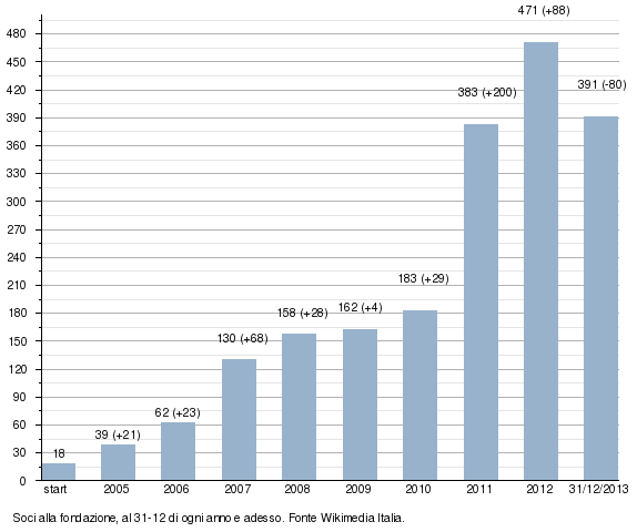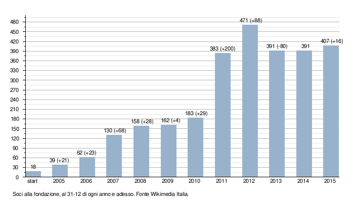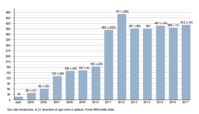 <timeline> Colors= id:lightgrey value:gray(0.9) id:darkgrey value:gray(0.7) id:sfondo value:rgb(1,1,1) id:barra value:rgb(0.6,0.7,0.8) ImageSize = width:880 height:400 PlotArea = left:50 bottom:50 top:30 right:30 DateFormat = x.y Period = from:0 till:500 TimeAxis = orientation:vertical AlignBars = justify ScaleMajor = gridcolor:darkgrey increment:30 start:0 ScaleMinor = gridcolor:lightgrey increment:15 start:0 BackgroundColors = canvas:sfondo BarData= bar:2004 text:start bar:2005 text:2005 bar:2006 text:2006 bar:2007 text:2007 bar:2008 text:2008 bar:2009 text:2009 bar:2010 text:2010 bar:2011 text:2011 bar:2012 text:2012 bar:2013 text:2013 bar:2014 text:2014 bar:2015 text:2015 bar:2016 text:2016 bar:2017 text:2017 bar:2018 text:2018 bar:2019 text:2019 bar:2020 text:2020 bar:2021 text:2021 bar:2022 text:2022 bar:2023 text:2023 bar:2024 text:2024 PlotData= color:barra width:30 align:left bar:2004 from:0 till: 18 bar:2005 from:0 till: 39 bar:2006 from:0 till: 62 bar:2007 from:0 till: 130 bar:2008 from:0 till: 158 bar:2009 from:0 till: 162 bar:2010 from:0 till: 183 bar:2011 from:0 till: 383 bar:2012 from:0 till: 471 bar:2013 from:0 till: 391 bar:2014 from:0 till: 391 bar:2015 from:0 till: 407 bar:2016 from:0 till: 396 bar:2017 from:0 till: 412 bar:2018 from:0 till: 415 bar:2019 from:0 till: 367 bar:2020 from:0 till: 303 bar:2021 from:0 till: 332 bar:2022 from:0 till: 317 bar:2023 from:0 till: 354 bar:2024 from:0 till: 282 PlotData= bar:2004 at: 18 fontsize:S text: 18 shift:(-5,5) bar:2005 at: 39 fontsize:S text: 39_(+21) shift:(-20,5) bar:2006 at: 62 fontsize:S text: 62_(+23) shift:(-20,5) bar:2007 at: 130 fontsize:S text: 130_(+68) shift:(-20,5) bar:2008 at: 158 fontsize:S text: 158_(+28) shift:(-20,5) bar:2009 at: 162 fontsize:S text: 162_(+4) shift:(-15,5) bar:2010 at: 183 fontsize:S text: 183_(+29) shift:(-20,5) bar:2011 at: 383 fontsize:S text: 383_(+200) shift:(-25,5) bar:2012 at: 471 fontsize:S text: 471_(+88) shift:(-20,5) bar:2013 at: 391 fontsize:S text: 391_(-80) shift:(-20,5) bar:2014 at: 391 fontsize:S text: 391 shift:(-5,5) bar:2015 at: 407 fontsize:S text: 407_(+16) shift:(-25,5) bar:2016 at: 396 fontsize:S text: 396_(-11) shift:(-20,5) bar:2017 at: 412 fontsize:S text: 412_(+16) shift:(-20,5) bar:2018 at: 415 fontsize:S text: 415_(+3) shift:(-15,5) bar:2019 at: 367 fontsize:S text: 367_(-48) shift:(-20,5) bar:2020 at: 303 fontsize:S text: 303_(-64) shift:(-20,5) bar:2021 at: 332 fontsize:S text: 332_(+29) shift:(-20,5) bar:2022 at: 317 fontsize:S text: 317_(-15) shift:(-20,5) bar:2023 at: 354 fontsize:S text: 354_(+37) shift:(-20,5) bar:2024 at: 282 fontsize:S text: 282_(-72) shift:(-20,5) TextData= fontsize:S pos:(25,25) text:Soci alla fondazione, al 31 dicembre di ogni anno e adesso. Fonte Wikimedia Italia. </timeline>