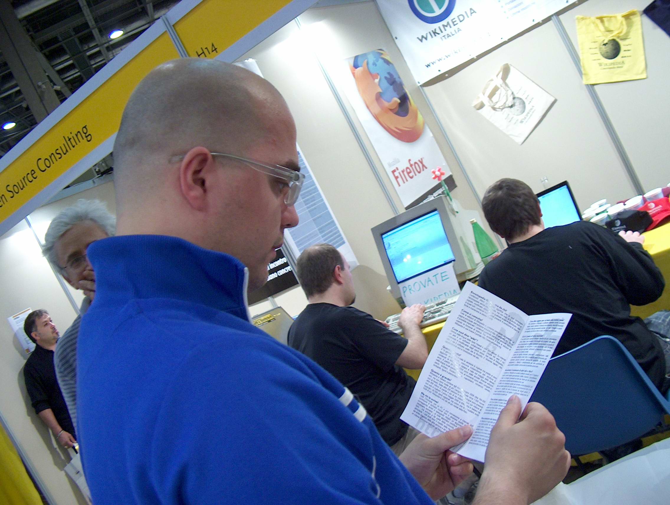 Wikipediani: Mizardellorsa, dietro all'uomo in primo piano; Snowdog, seduto a sinistra; Fabexplosive, seduto a destra.