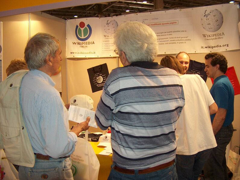 Wikipediani: Da quello in primo piano a quello dopo l'angolo dello stand: Mizardellorsa, Laurentius, Dracoroboter, Snowdog.