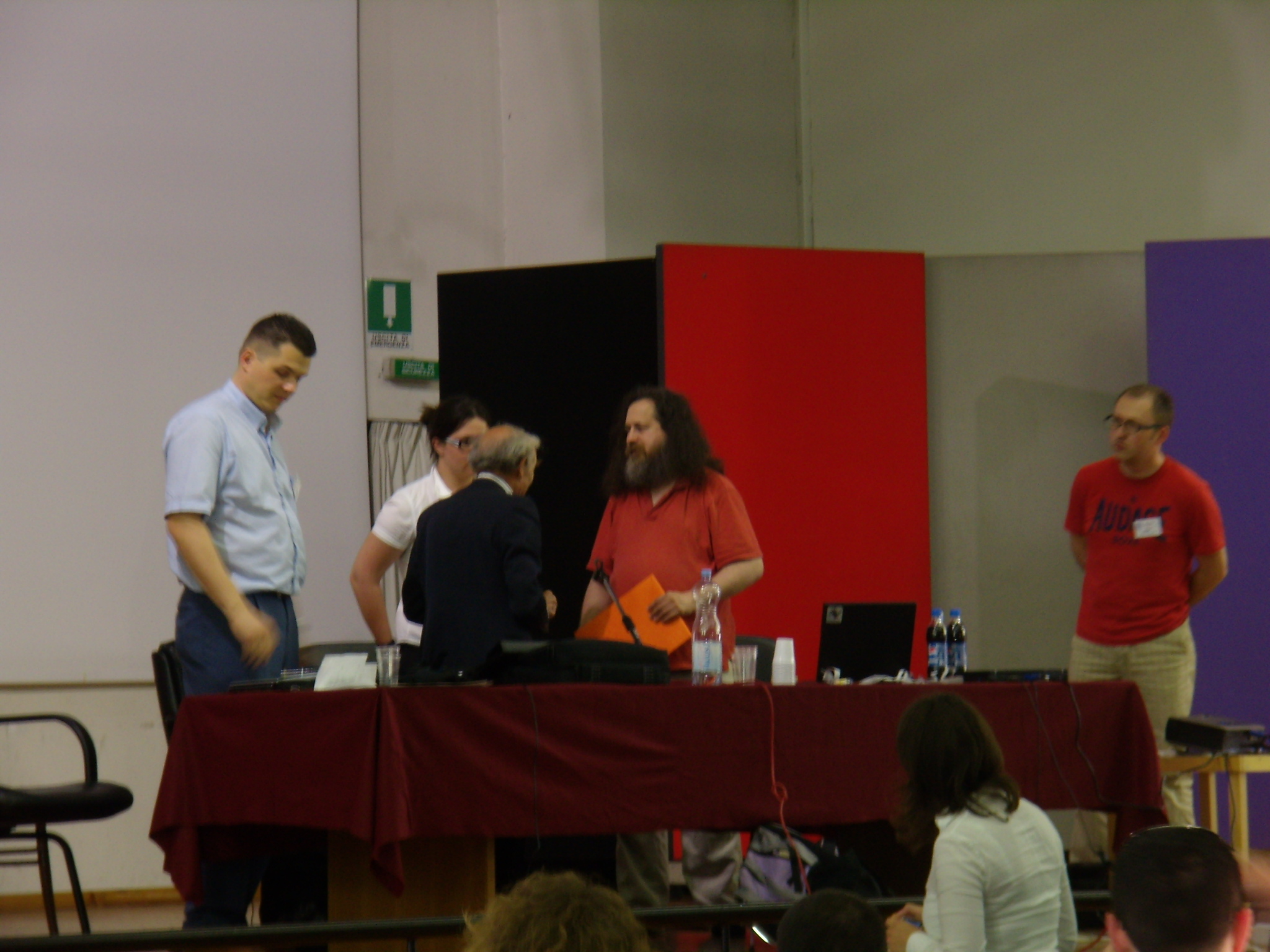 Francesco Piva (Comunità libere attività culturali - Centro UNESCO PD) consegna a Richard Stallman un riconoscimento al Software libero, come Tesoro Immateriale FMACU UNESCO (Federazione Mondiale dei Club, Centri e Associazioni UNESCO), durante il Pluto meeting 2007
