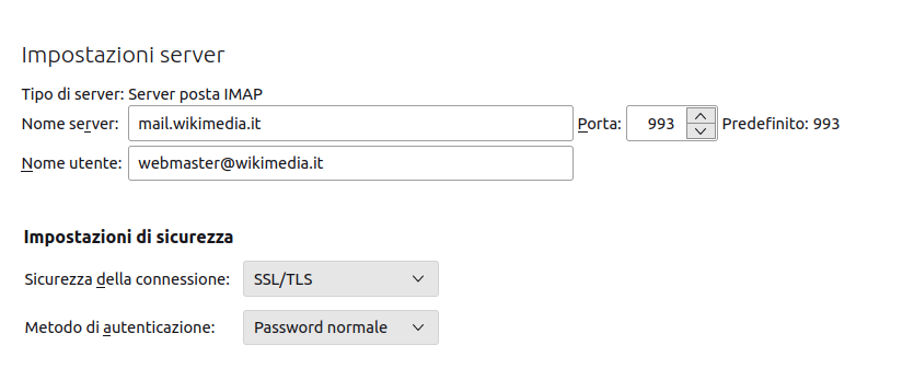 Esempio configurazione Thunderbird con account Wikimedia - server IMAP + SSL