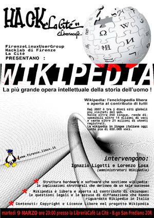 Martedì 9 marzo 2010, Lorenzo Losa e Ignazio Ligotti (Wikimedia Italia) partecipano all'HackNight dal titolo Wikipedia, la più grande opera intellettuale della storia dell'uomo, organizzata dal Firenze Linux User Group, HackLab di Firenze e libreria La Citè.