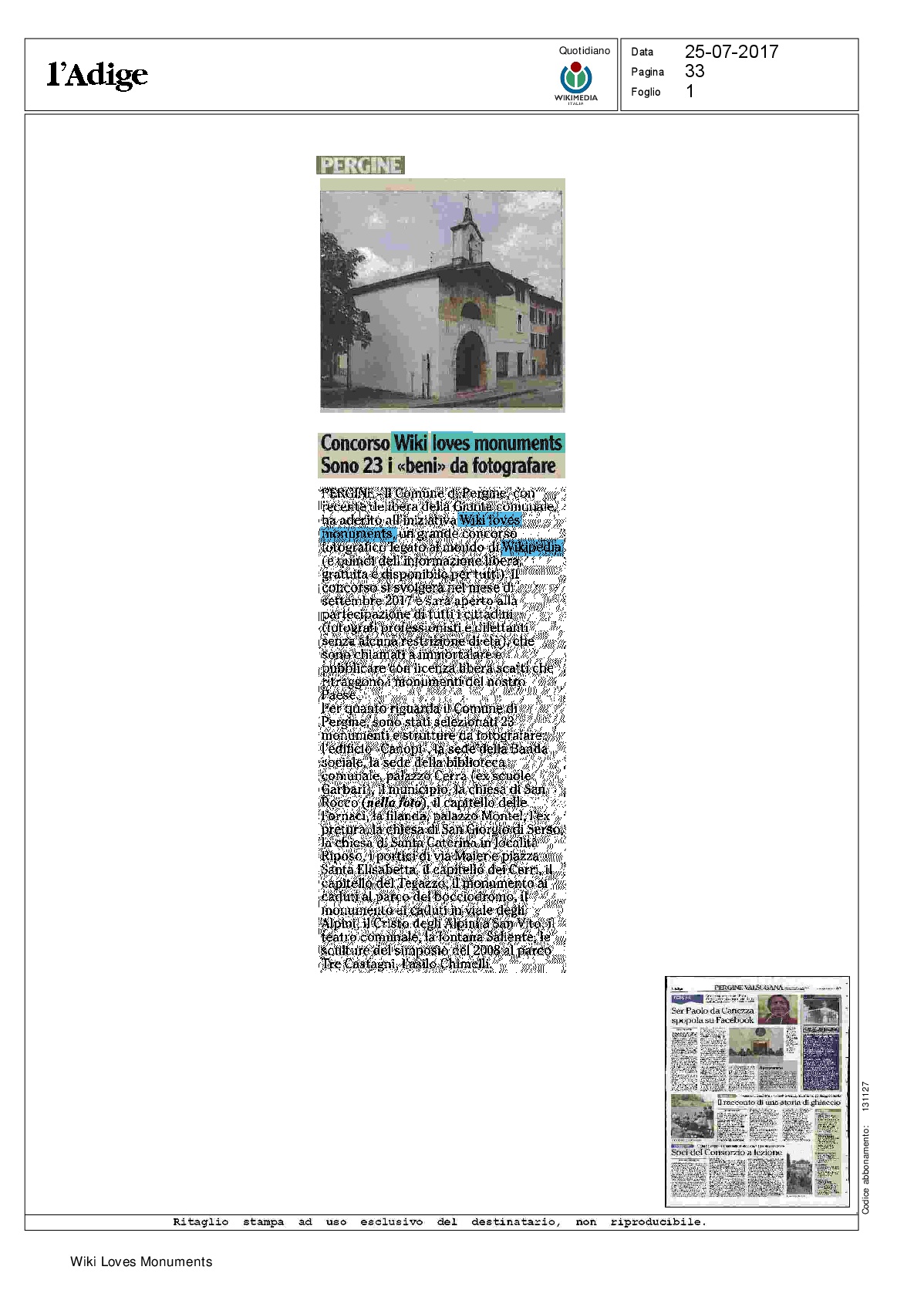 - Pergine, concorso Wiki Loves monuments. Sono 23 i "beni" da fotografare, l'Adige