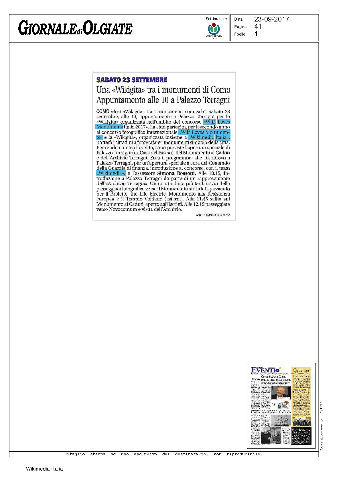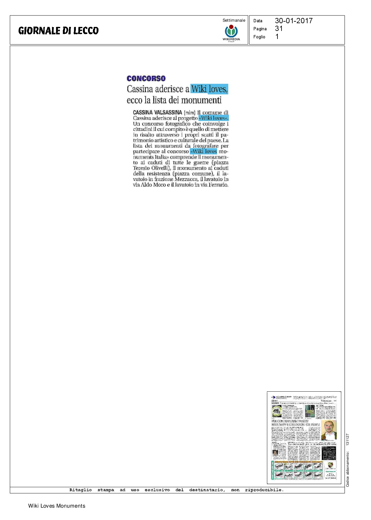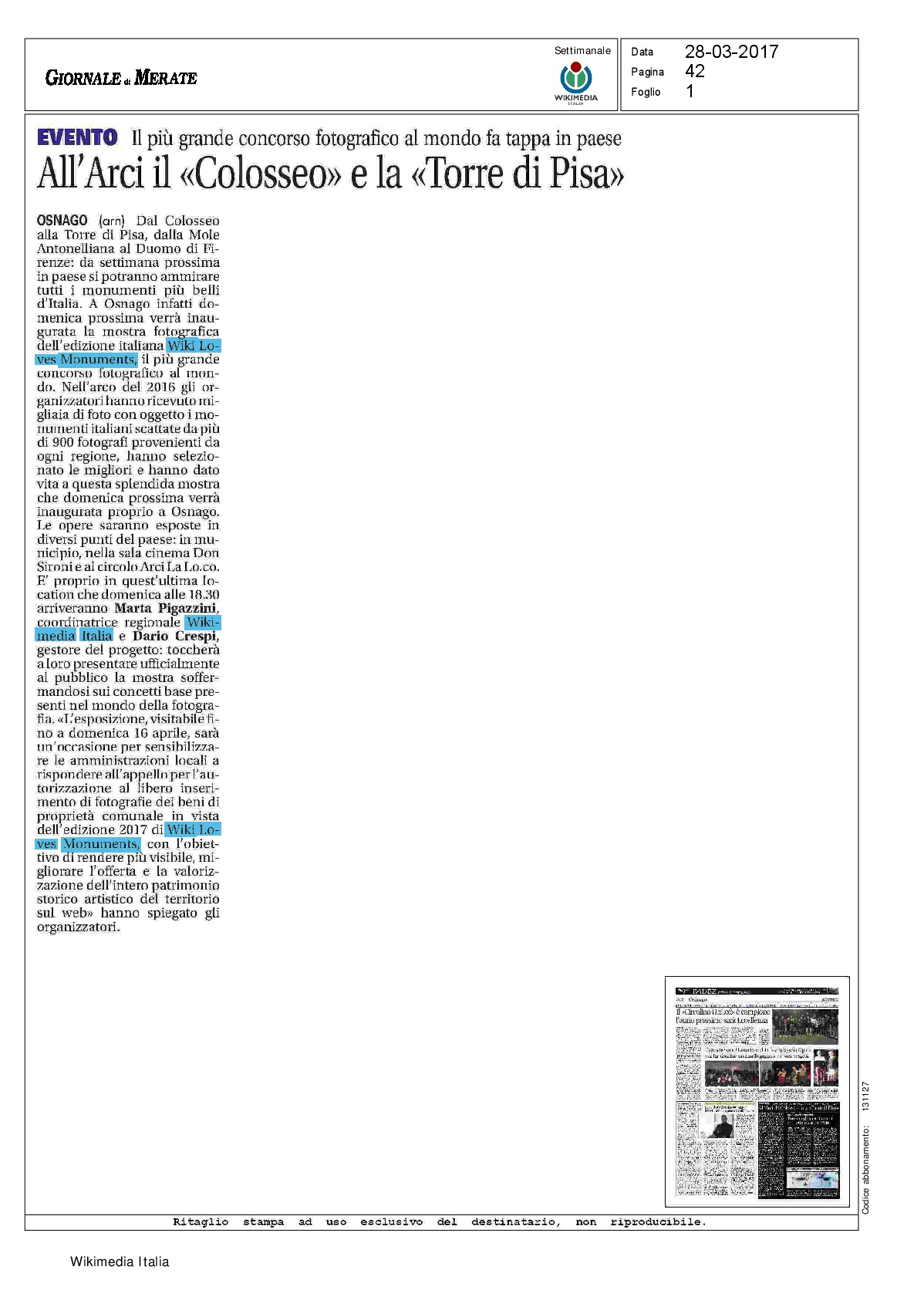 - La mostra fotografica organizzata da Wikipedia debutta alla Lo.Co: 1300 monumenti in paese, di Paolo Brambilla, Giornale di Merate