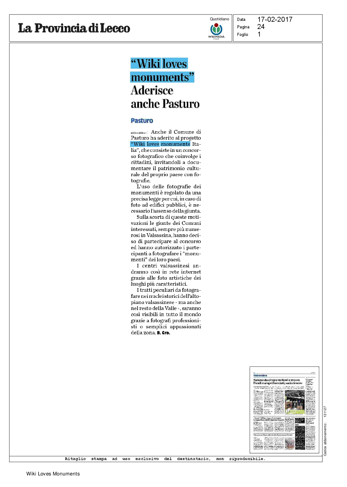- "Wiki Loves Monuments" aderisce anche Pasturo, La Provincia di Lecco