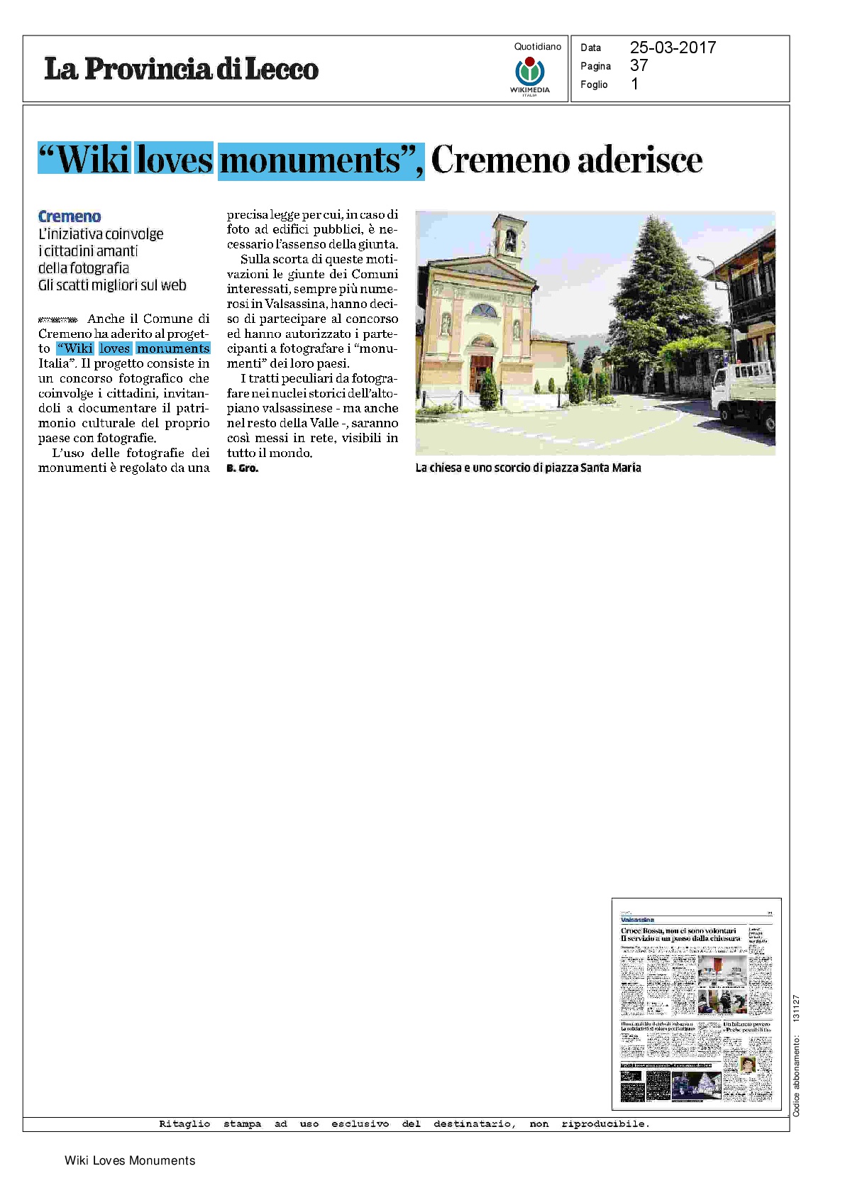 - "Wiki loves monuments", Cremeno aderisce, La Provincia di Lecco