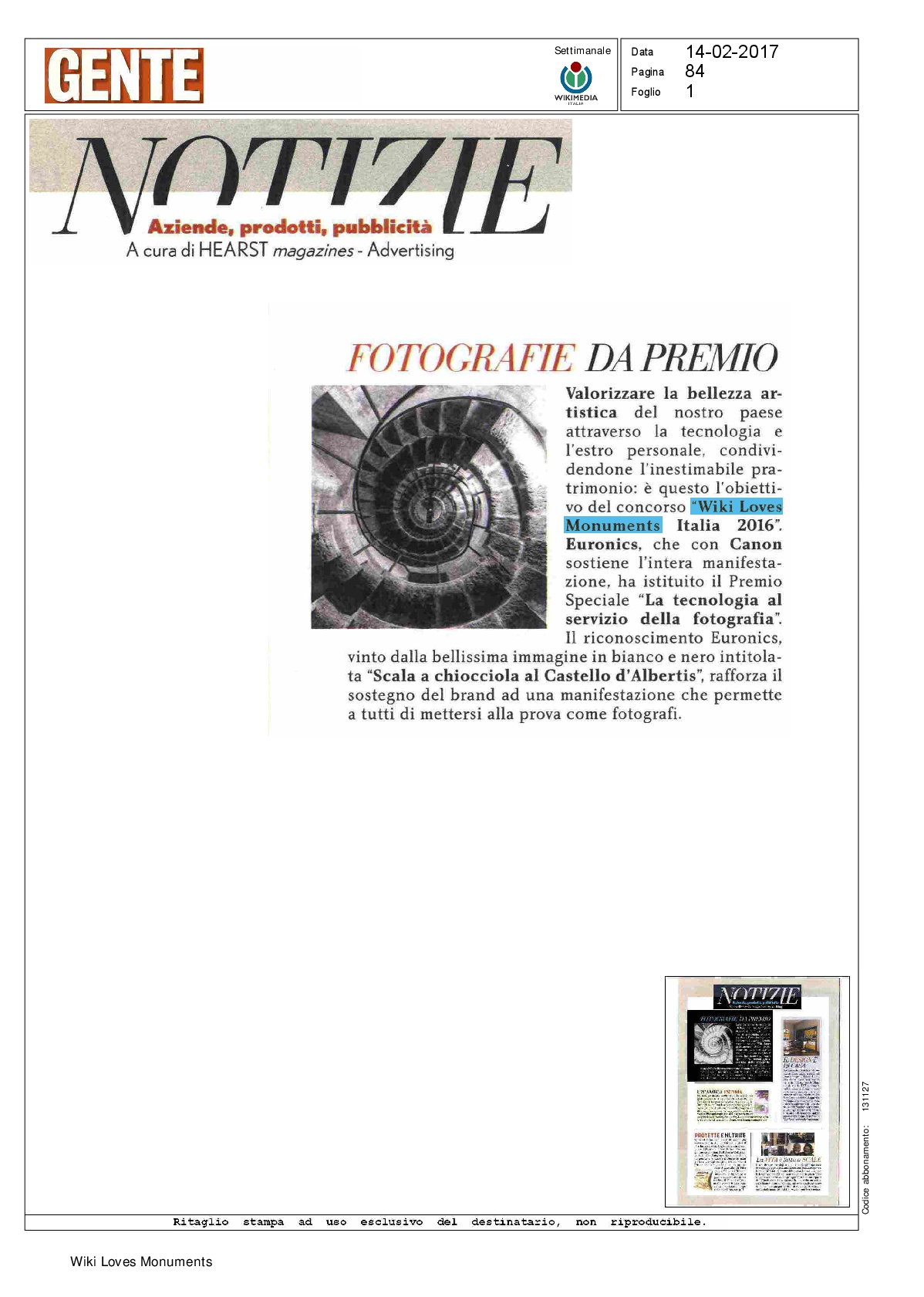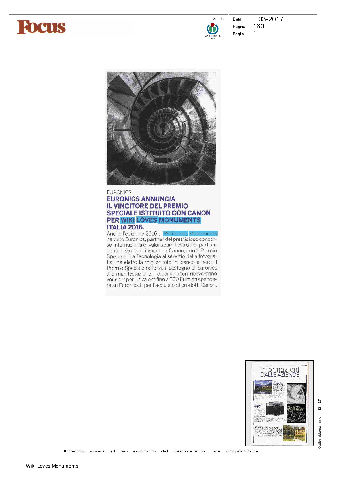 - Euronics annuncia il vincitore del premio istituito con Canon per Wiki Loves Monuments Italia 2016, Focus