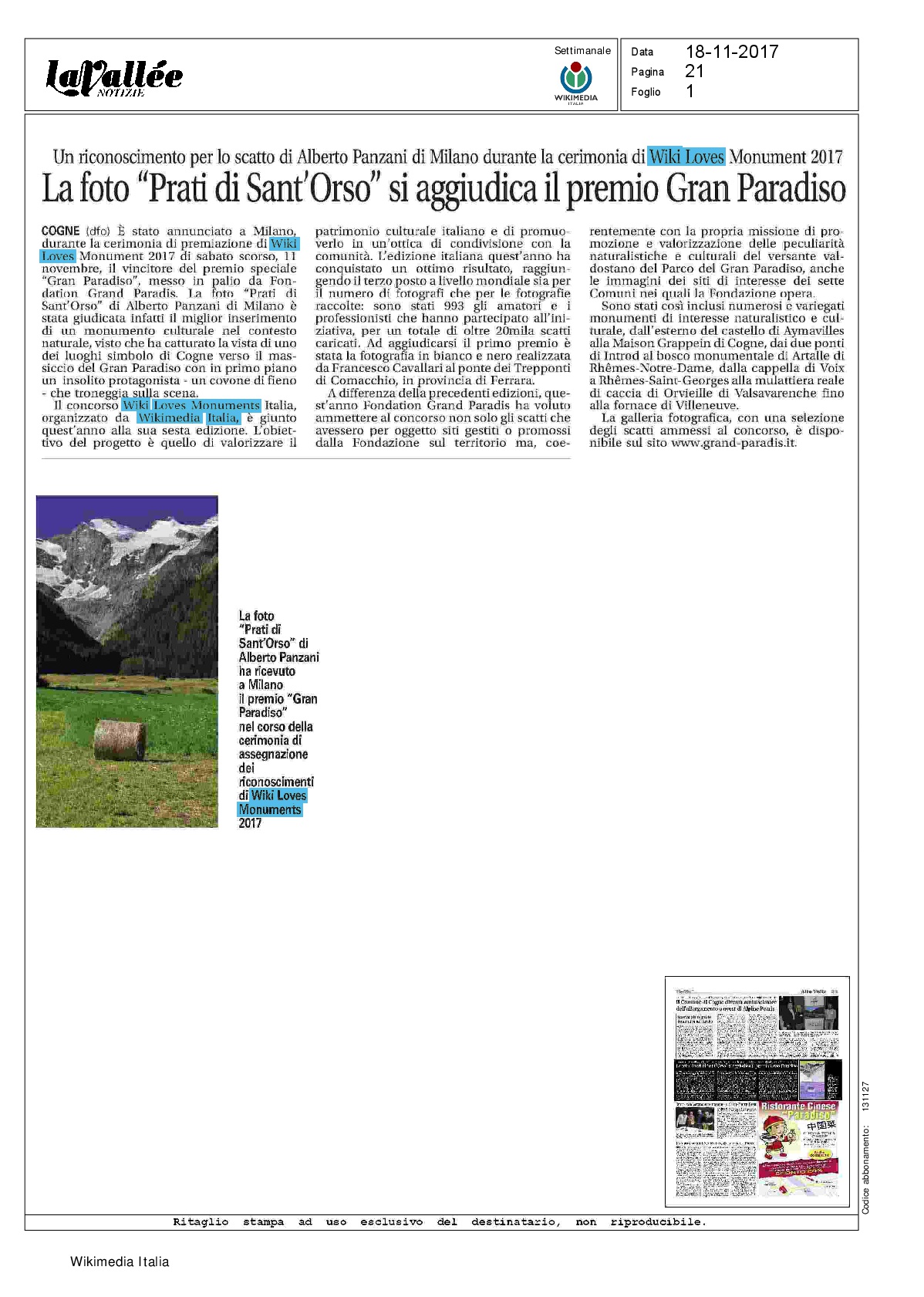 - Wiki Loves Monuments 2017 - Il Premio "Gran Paradiso" allo scatto dei Prati di Sant'Orso di Alberto Panzani, aostanews24.it