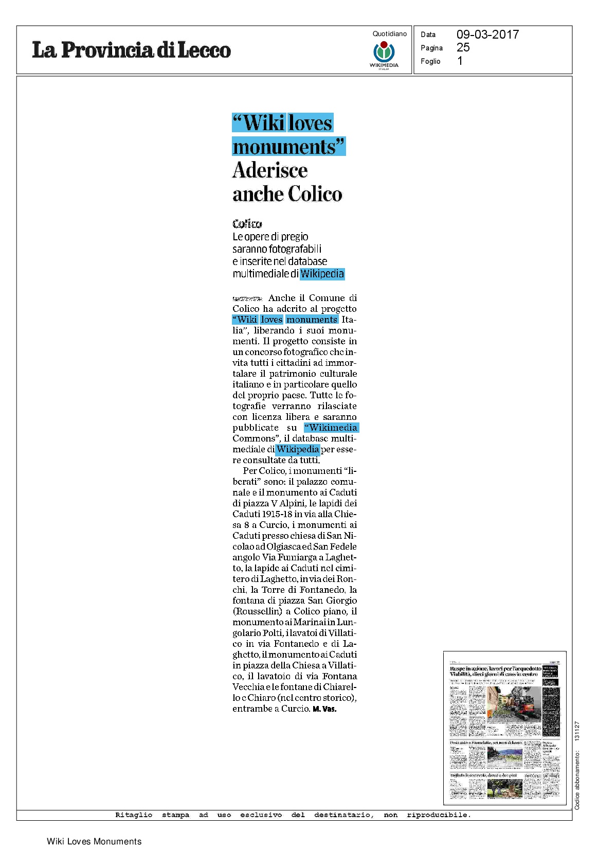 - "Wiki Loves Monuments", aderisce anche Colico, La Provincia di Lecco