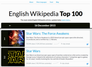 - Per rendere più fruibili i dati relativi alle visualizzazioni delle pagine Wikipedia e degli altri progetti, sono stati creati appositi tool, tra i quali vi segnaliamo Hatnote Top 100, che quotidianamente mostra la classifica dei 100 articoli più visitati su Wikipedia.