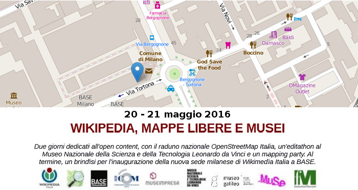 Vi ricordiamo l'appuntamento per il 20 e 21 maggio, a Milano, presso BASE e il Museo Nazionale della Scienza e della Tecnologia Leonardo da Vinci, per una due giorni dedicata all'open content, ricca di eventi: vi saranno il raduno nazionale di OpenStreetMap Italia, un'editathon, un mapping party e la festa di inaugurazione della nuova sede di Wikimedia Italia. Vi aspettiamo per questo weekend di full-immersion nel mondo Wikimedia. C'è ancora tempo per segnalare la propria presenza: è sufficiente compilare il modulo a questo link. Consultate il programma e indicate a quale momento della giornata parteciperete.