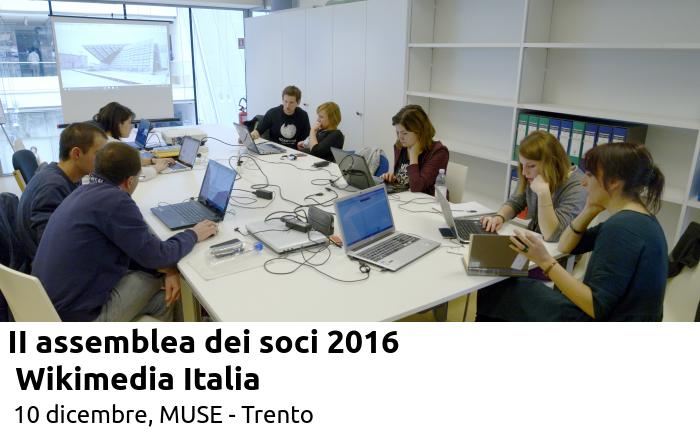 La seconda assemblea ordinaria dei soci per il 2016 è fissata per sabato 10 dicembre e si terrà presso il Museo MUSE di Trento, con prima convocazione alle ore 10.00 e seconda convocazione alle ore 14.00. La giornata si aprirà con una visita al Museo della durata di un'ora e mezza, gratuita per tutti i soci Wikimedia e a seguire si apriranno i lavori dell’assemblea, che proseguiranno fino alle 13. Nel pomeriggio – dopo la pausa pranzo – si entrerà nel vivo della discussione, con la presentazione del piano strategico per il prossimo triennio e del bilancio preventivo 2017, oltre alla ratifica delle delibere del consiglio direttivo. Per partecipare all’assemblea è sufficiente registrarsi compilando l'apposito modulo sulla piattaforma Eventbrite (è gratuito e richiede solo due minuti), dove è possibile confermare anche la propria partecipazione alla visita guidata del Museo. La partecipazione all'Assemblea è aperta a tutti, ma solo i soci in regola con il versamento della quota 2016 avranno diritto di voto e di delega.