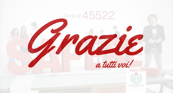 L’enciclopedia libera arriverà quest’anno a numerosi alunni delle scuole italiane grazie a tutti voi, che in questi giorni ci avete supportato inviando SMS e chiamando il numero solidale 45522, avete partecipato al nostro quiz #wikipediascuola su Facebook e vi siete fatti portavoce della nostra iniziativa attraverso i social e il passaparola. La nostra campagna 2017 con numero solidale si è conclusa questo lunedì, 12 giugno: leggi l'articolo per scoprire com'è andata.