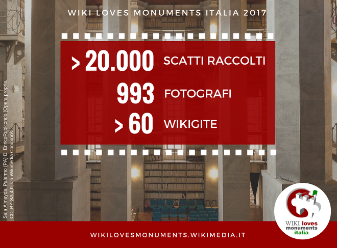 A mezzanotte di sabato 30 settembre si è conclusa la sesta edizione italiana di Wiki Loves Monuments, il grande concorso che valorizza il patrimonio culturale portandolo online sui progetti Wikimedia. Grazie all’entusiasmo e alla grinta degli utenti italiani, abbiamo conquistato un risultato grandioso, raggiungendo il terzo posto a livello mondiale sia per numero di fotografi che per scatti raccolti. Scopri di più nell'articolo!
